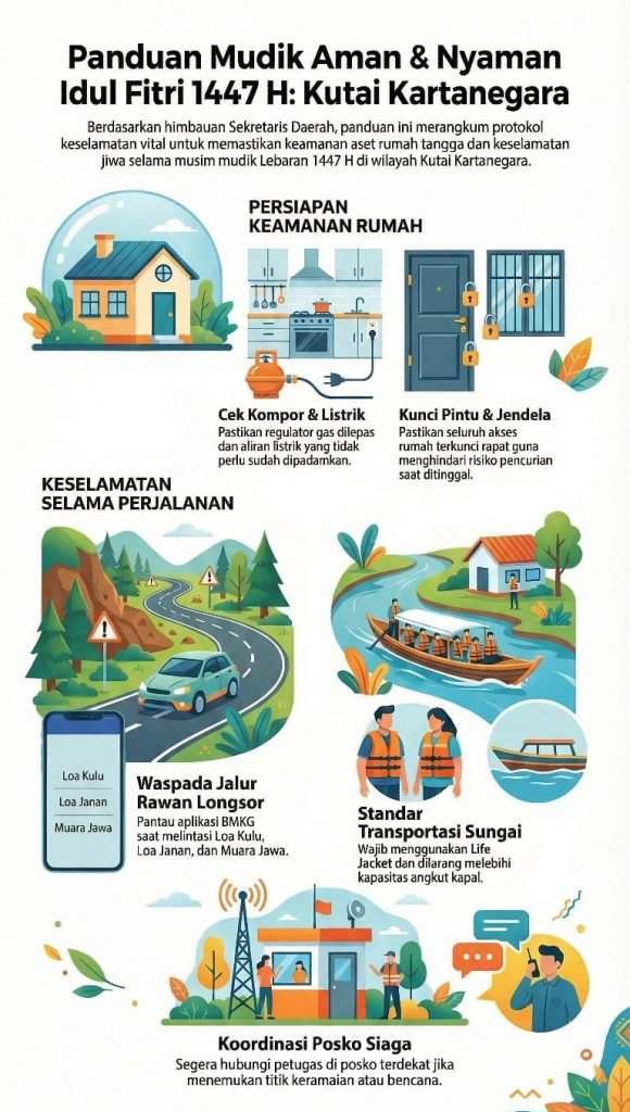 Sebagai bentuk sosialisasi kepada masyarakat, BPBD Kukar juga menyajikan panduan visual “Mudik Aman dan Nyaman Idul Fitri 1447 H” yang merangkum langkah-langkah penting dalam menjaga keamanan rumah, kewaspadaan di jalur rawan longsor, keselamatan transportasi sungai, serta koordinasi dengan posko siaga.