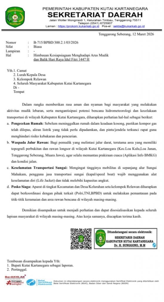 Surat yang ditandatangani secara elektronik oleh Sekretaris Daerah Kukar, Dr. H. Sunggono, M.M pada 12 Maret 2026 tersebut berisi imbauan kepada camat, lurah/kepala desa, kelompok relawan, serta masyarakat di wilayah Kutai Kartanegara agar meningkatkan kewaspadaan selama periode mudik Lebaran.